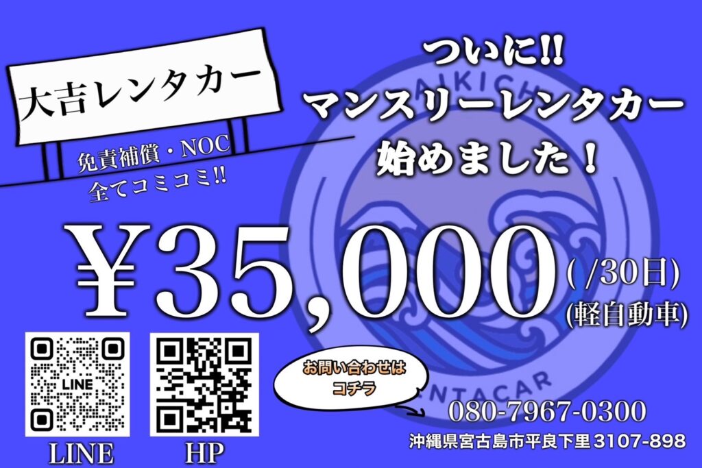 大吉レンタカー宮古島店ではマンスリーレンタカーサービスをご提供しております。(宮古島店限定のサービスです)